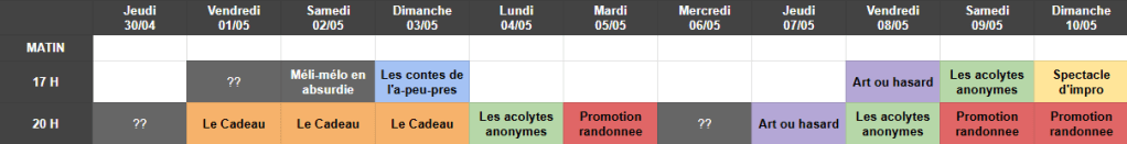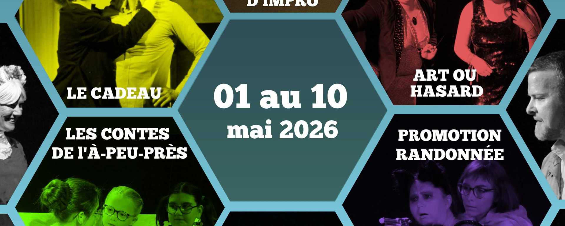 Du vendredi 01 mai au dimanche 10 mai 2026, ce sont une Ă deux reprĂ©sentations par jour qui rythmeront le festival, mĂȘlant théùtre contemporain, crĂ©ations collectives, improvisation et spectacles intergĂ©nĂ©rationnels.