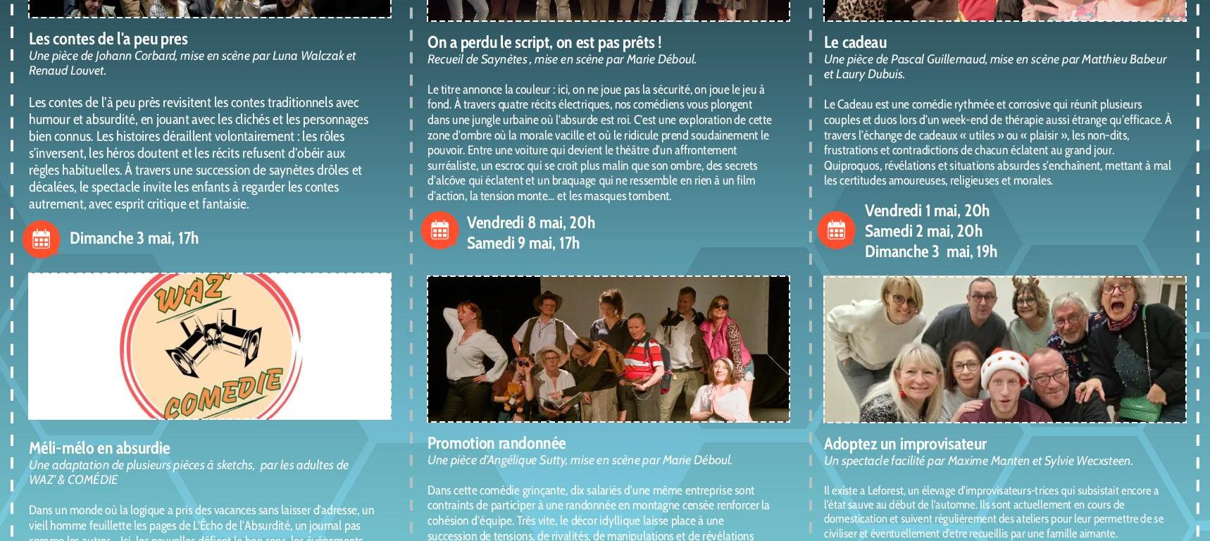 - On a perdu le script, on n’est pas prêts : L’énergie pure s’invite sur scène. Quatre récits électriques dans une jungle urbaine où le ridicule prend le pouvoir. Accrochez-vous, ça va secouer !